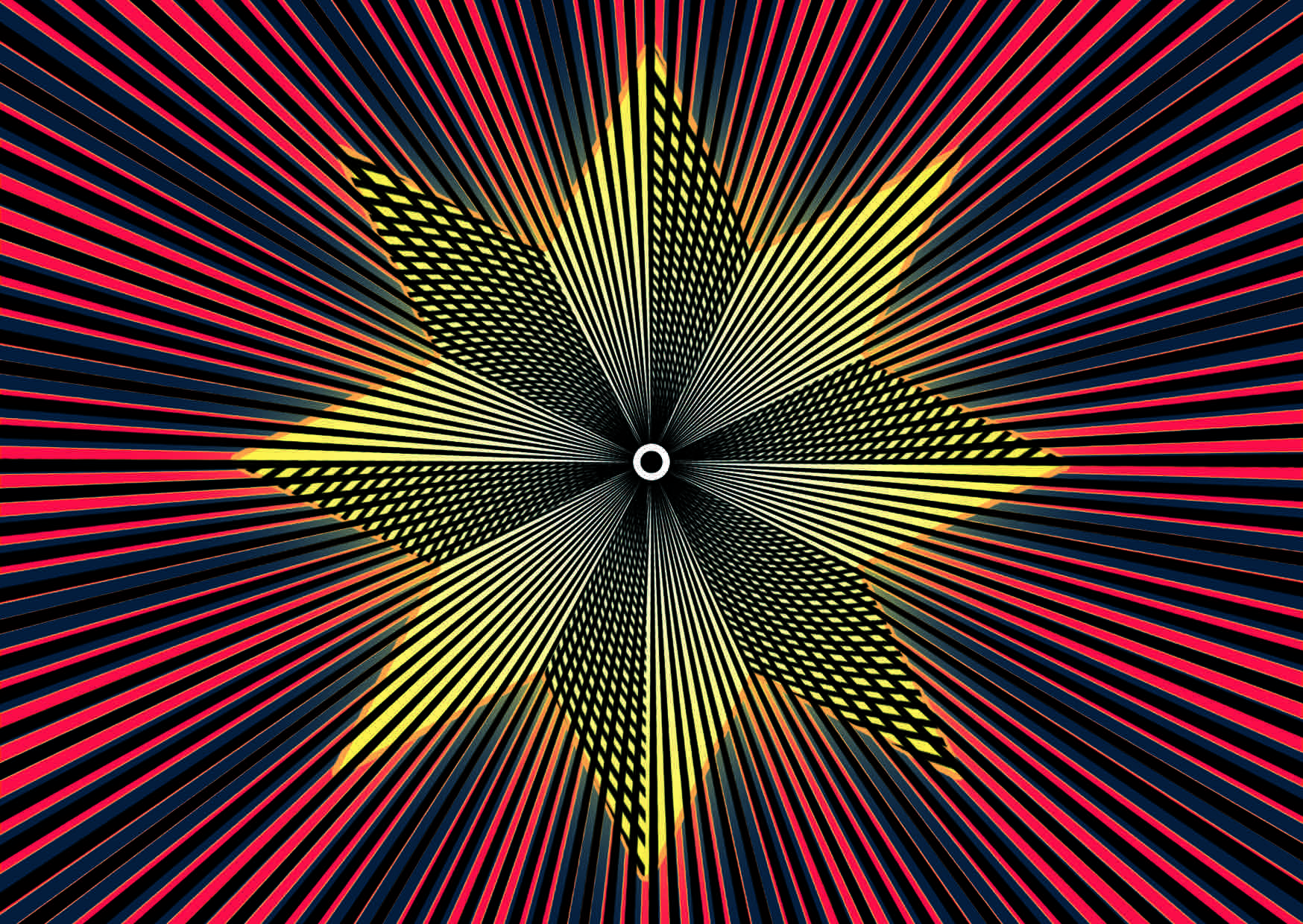 Ein lebhaftes Muster zeigt eine strahlenförmige Anordnung in Gelb und Schwarz, die eine Sternform erzeugt. Die dynamischen Linien vermitteln ein Gefühl von Bewegung und Energie.