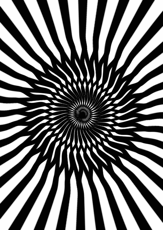 Das Bild zeigt ein faszinierendes schwarz-weißes Muster mit sich verjüngenden Linien, die in einer spiralförmigen Anordnung verlaufen und eine hypnotische Wirkung erzeugen.