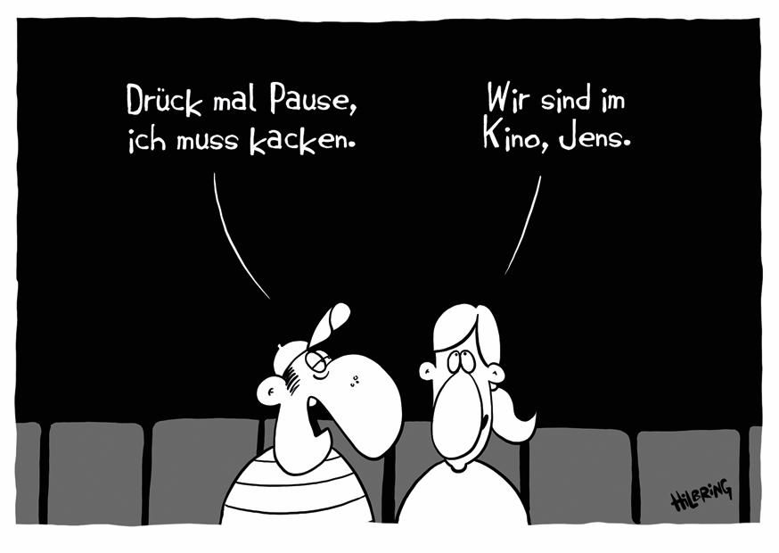 Zwei Charaktere unterhalten sich im Kino. Ein Mann bittet um eine Pause, um zur Toilette zu gehen. Dies sorgt für Lachen und Heiterkeit.