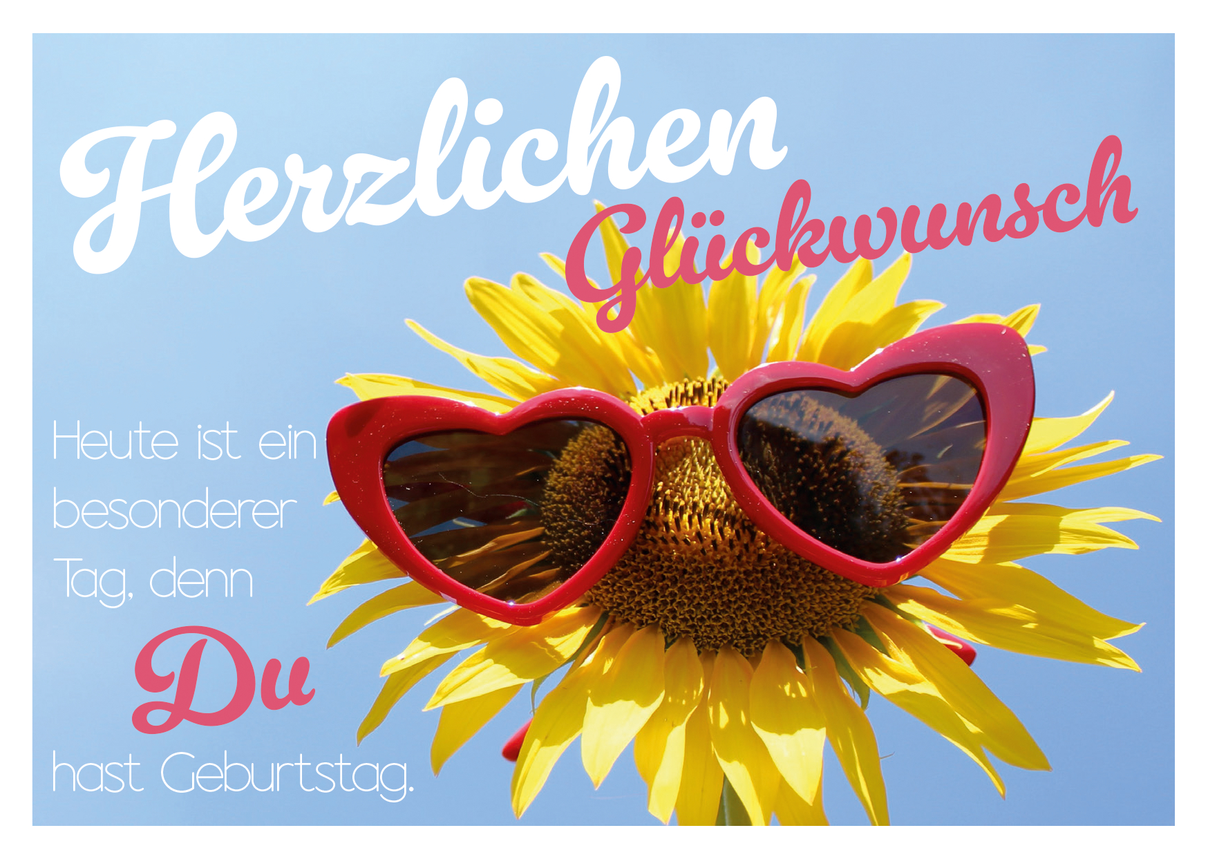 Eine herzliche Geburtstagskarte zeigt eine strahlende Sonnenblume mit einer roten Herzbrille. Der Text feiert einen besonderen Geburtstag und vermittelt Freude.