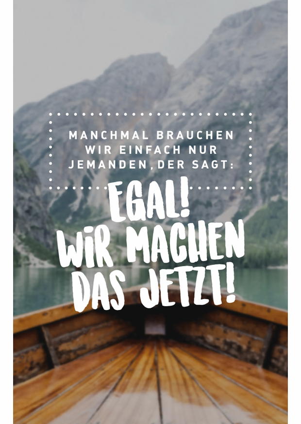 Ein Boot auf ruhigem Wasser bietet eine wunderschöne Aussicht auf majestätische Berge. Die Schrift motiviert dazu, aktiv zu werden und Chancen zu nutzen.
