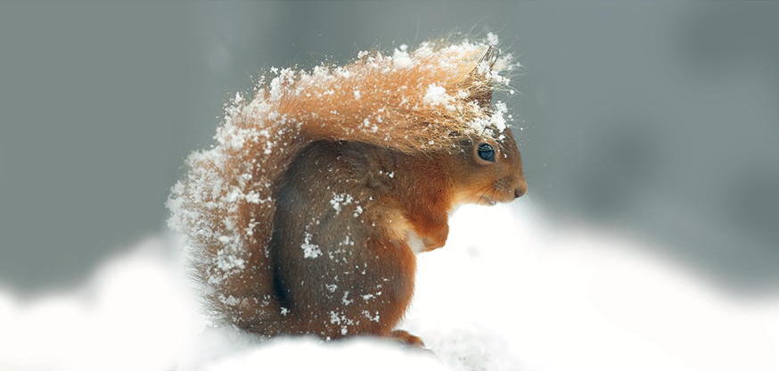 Ein Eichhörnchen steht in einer winterlichen Landschaft, sein Fell ist mit Schnee bedeckt. Die Umgebung ist friedlich und einladend, während es in der Kälte verweilt.