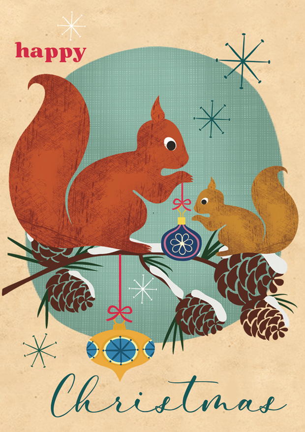 Zwei fröhliche Eichhörnchen sind in einem winterlichen Wald zu sehen, während sie sich um einen glänzenden Weihnachtsschmuck versammeln.