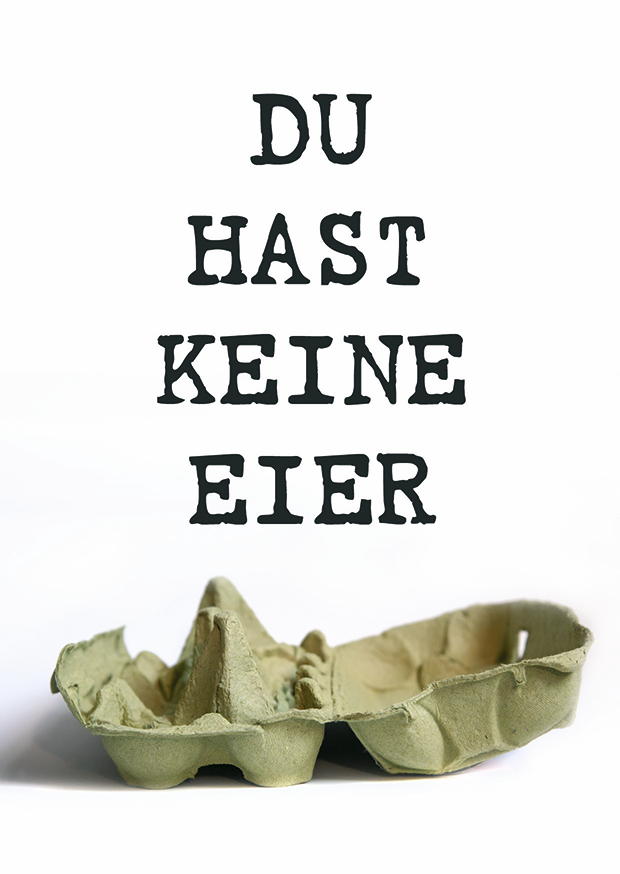 Ein leerer Eierkarton liegt auf einem hellen Hintergrund und trägt den humorvollen Spruch Du hast keine Eier, perfekt für einen lustigen Akzent in der Küche.