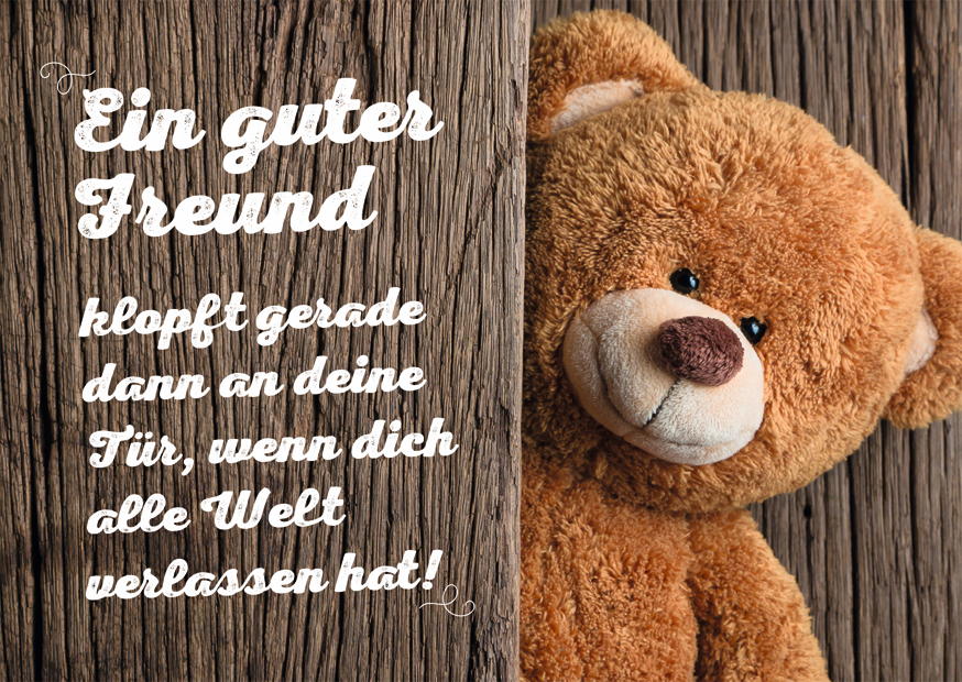 Auf einer rustikalen Holzwand sitzt ein Teddybär und blickt auf eine liebevolle Botschaft, die die Wichtigkeit von Freundschaft und Unterstützung betont.