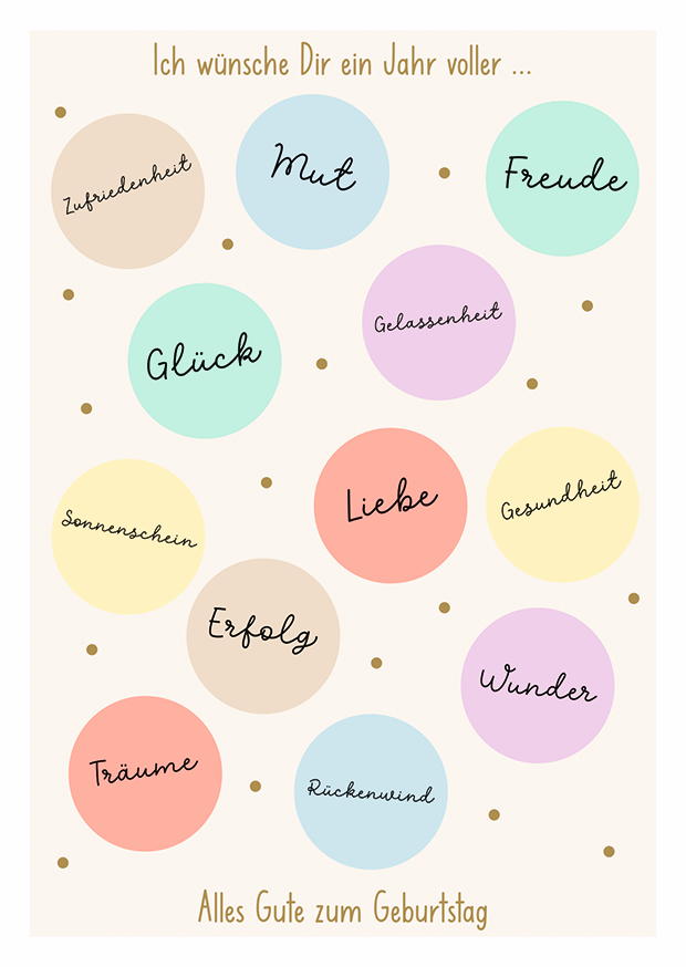 Eine festliche Geburtstagskarte zeigt liebevolle Wünsche wie Freude, Glück und Erfolg, um das neue Lebensjahr mit positiven Gedanken zu beginnen.