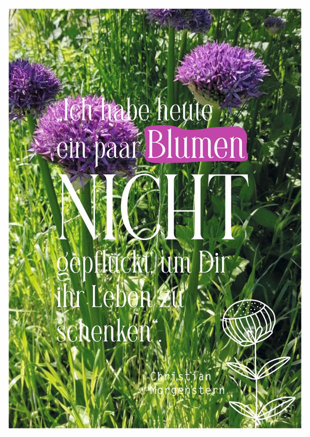 Eine lila Blume steht im Vordergrund einer bunten Wiese. Der Text darauf vermittelt eine liebevolle Botschaft über das Schenken von Blumen und Freude im Frühling.