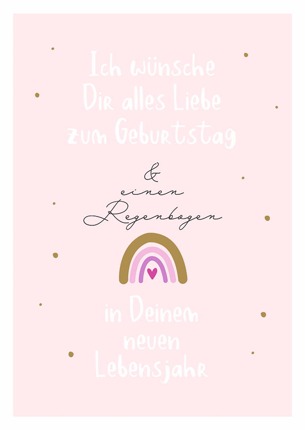 Auf einem sanften rosa Hintergrund stehen liebevolle Geburtstagsgrüße, umgeben von goldenen Punkten und einem bunten Regenbogen.