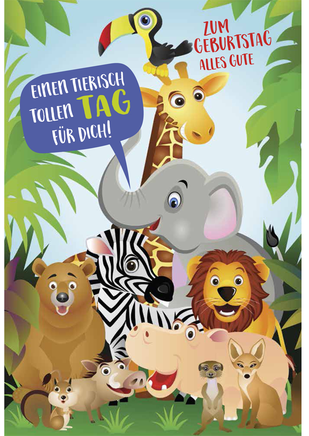 Eine farbenfrohe Gruppe von Tieren feiert einen Geburtstag im Dschungel. Ein Elefant, ein Löwe und andere Tiere gratulieren herzlich zum Festtag.
