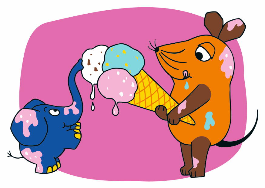Ein Elefant und eine Maus teilen sich glücklich eine große Eistüte mit verschiedenen Eissorten. Es ist ein warmer, sonniger Tag, ideal für ein süßes Vergnügen.