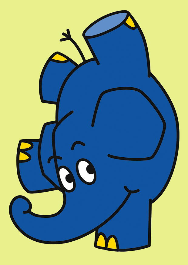 Der Elefant ist lebhaft in blauer Farbe gezeichnet und strahlt Freude aus. Seine großen Augen und das Lächeln vermitteln ein Gefühl von Spaß und Unbeschwertheit.