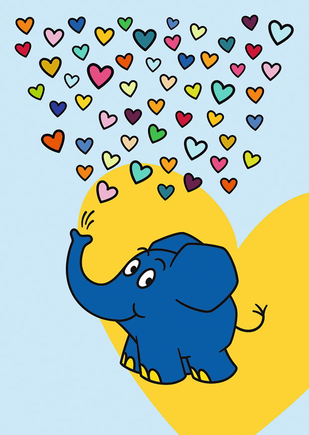 Ein niedlicher, blauer Elefant erweckt Freude, während er Herzen in verschiedenen Farben anzieht und eine fröhliche Atmosphäre schafft.