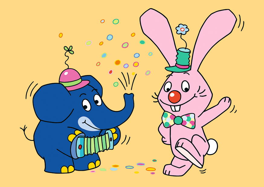 Der Elefant spielt fröhlich ein Instrument, während der Hase tanzend Konfetti um sich wirbelt. Beide Tiere tragen lustige Hüte und scheinen Spaß zu haben.