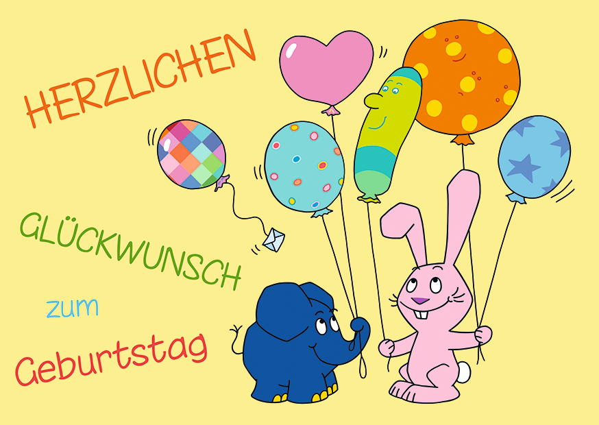Ein blauer Elefant und ein rosa Hase halten bunte Luftballons und gratulieren herzlich zum Geburtstag. Die fröhlichen Farben schaffen eine festliche Stimmung.