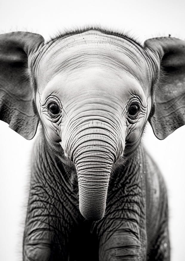Ein kleiner Elefant blickt direkt in die Kamera, seine großen Augen und der sanfte Ausdruck vermitteln Neugier und Unschuld in einem ruhigen Moment.