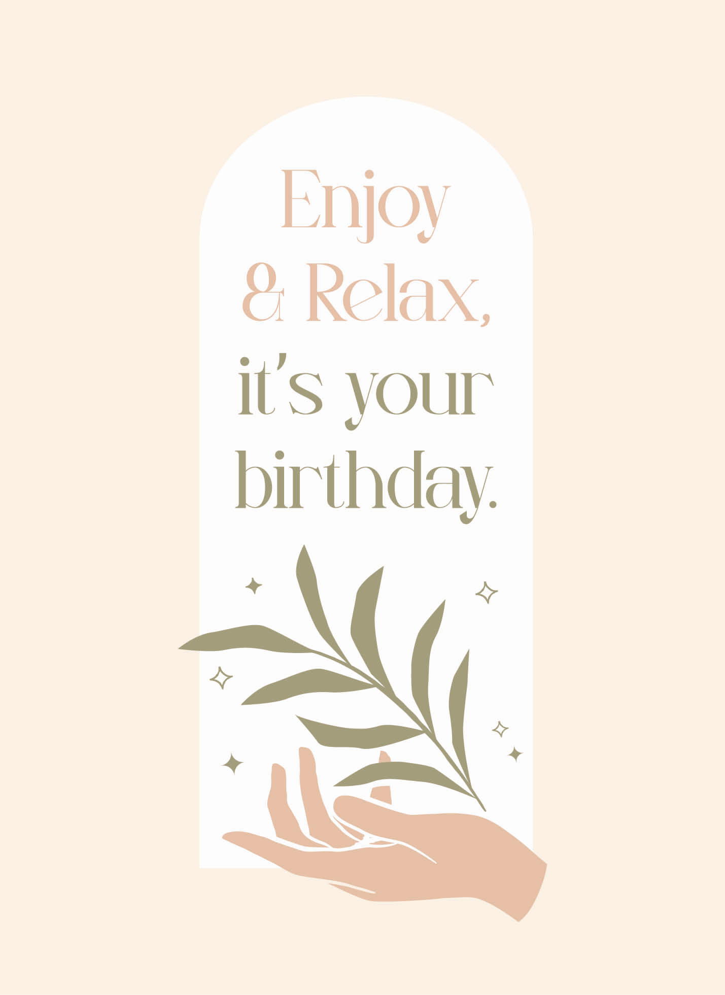 Ein schöner Geburtstagshinweis mit der Botschaft, sich zu entspannen und zu genießen, begleitet von einem schlichten Blattdesign und einem warmen Farbton.