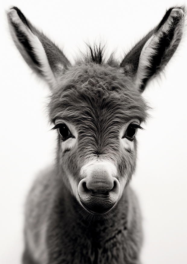 Das Fohlen blickt mit großen Augen direkt in die Kamera und zeigt seine niedliche Schnauze. Der helle Hintergrund hebt das Tier hervor und sorgt für einen fokussierten Eindruck.