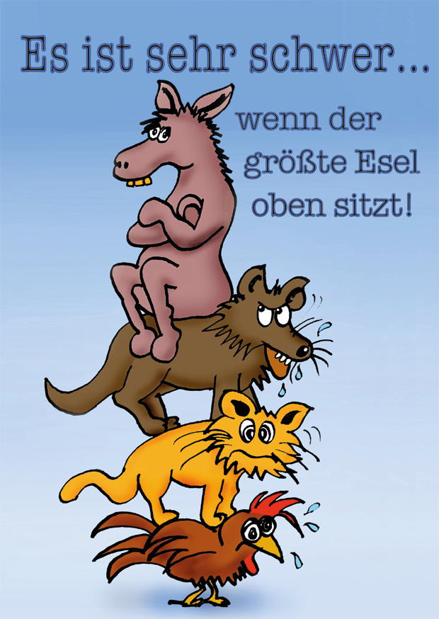 Drei Tiere versuchen humorvoll, einen Esel auf ihren Rücken zu balancieren, während sie verschiedene Herausforderungen meistern. Die Szene vermittelt ein Gefühl von Teamarbeit und Humor.