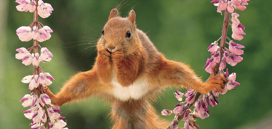 Ein Eichhörnchen sitzt unter bunten Blüten und hält seine Pfoten am Mund. Es genießt die frühlingshafte Umgebung und die frische Luft in einem Garten.
