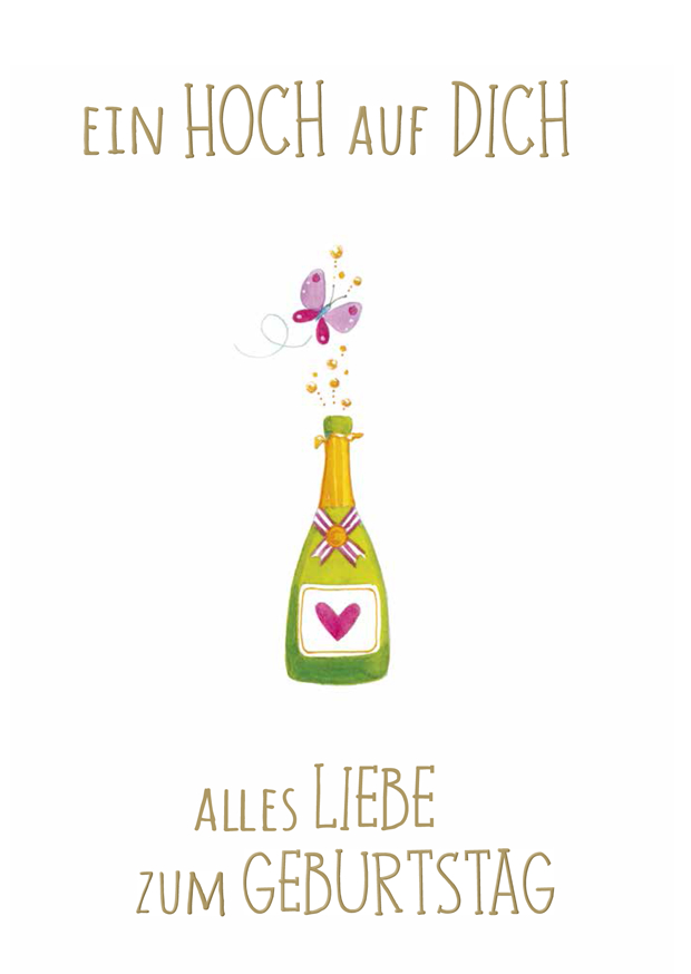 Auf der Karte prangt eine Sektflasche mit Herz, umgeben von einem Schmetterling und fröhlichen Herzen, perfekt für einen Geburtstag voller Freude und Liebe.