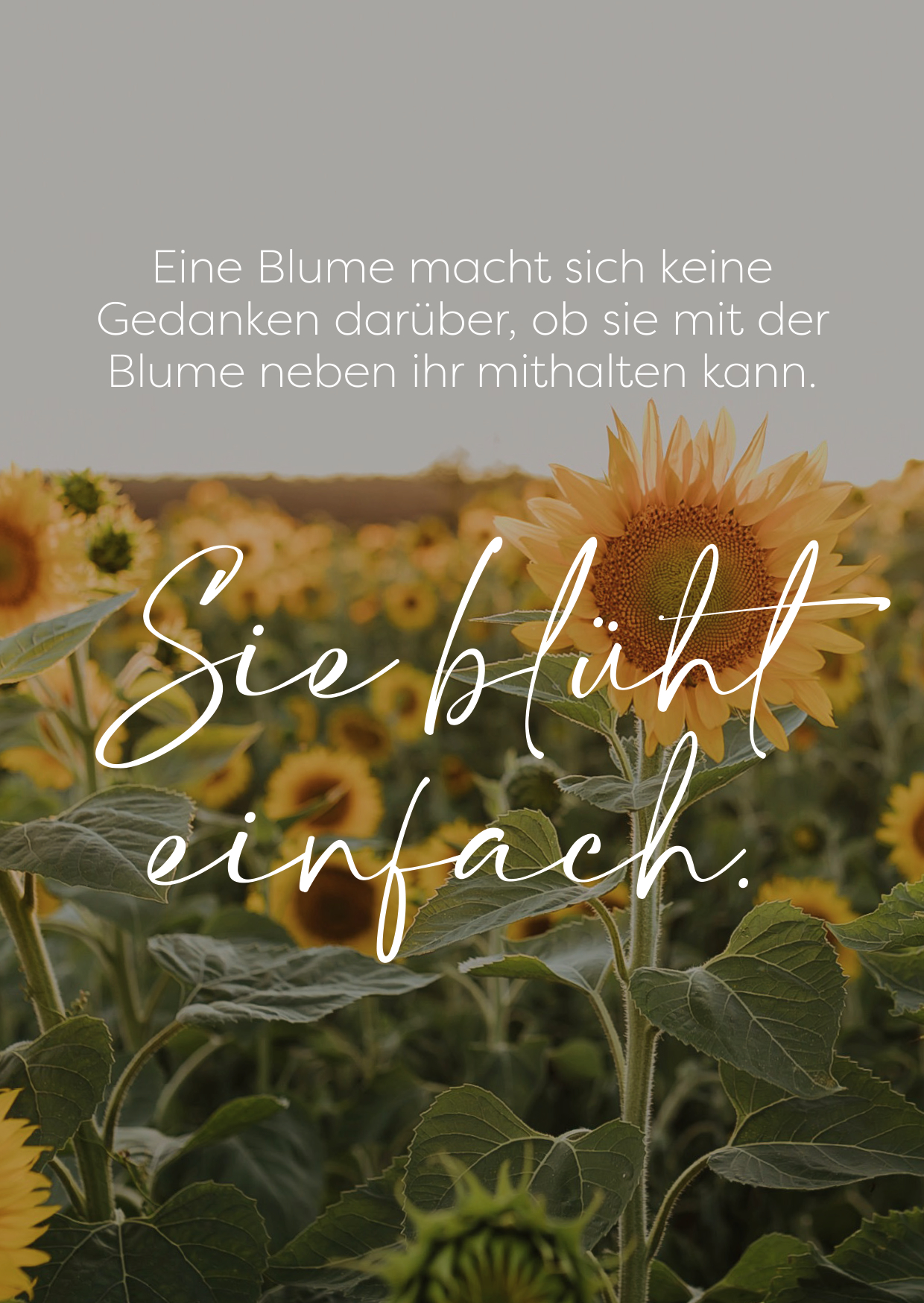 Bunte Sonnenblumen blühen in einem weitläufigen Feld. Sonne strahlt auf die Blumen, während ein Zitat über das einfache Sein eingeblendet ist.