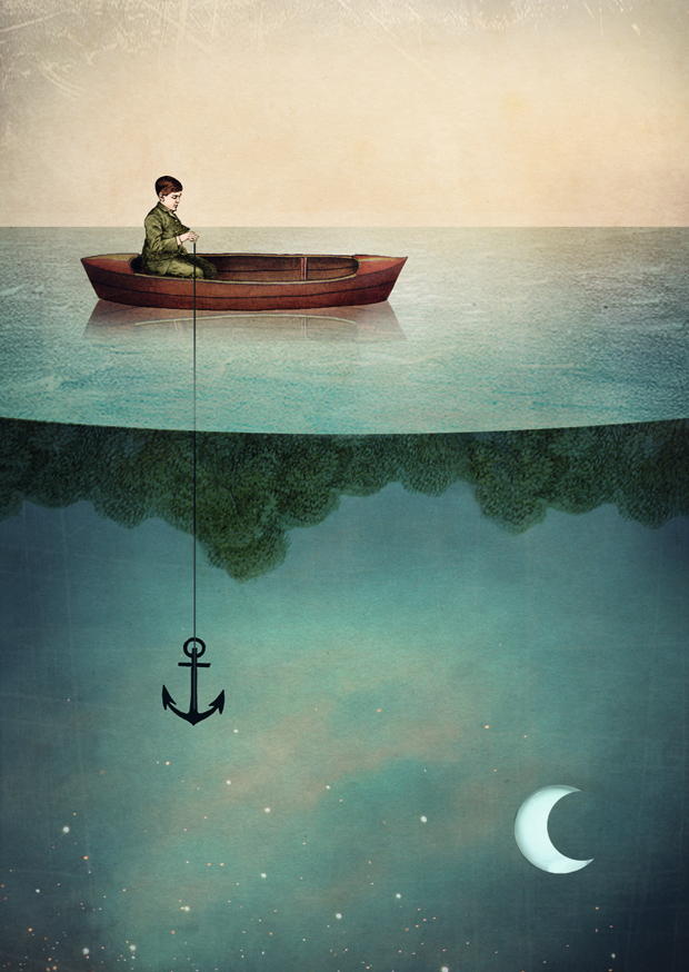 Ein junger Mann sitzt in einem kleinen Holzboot und angelt entspannt auf einem stillen See. Der Mond leuchtet und die Sterne funkeln im klaren Nachthimmel.