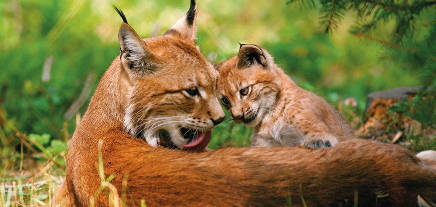Im warmen Licht der Nachmittags Sonne spielt ein Jungtier mit seiner Mutter in einer grünen Waldlandschaft während des Sommers.