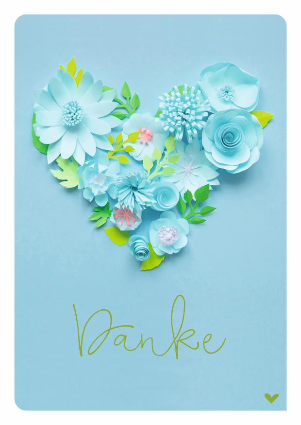 Die Karte zeigt ein kreatives Design aus Papierblumen in verschiedenen Blautönen, die in Herzform angeordnet sind. Darunter steht das Wort Danke in einer eleganten Schrift.