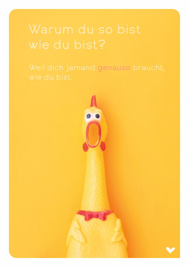 Ein leuchtend gelbes Gummihuhn mit offenem Schnabel steht auf einem hellen Untergrund. Die Aufschrift lädt zur Reflexion über Individualität und Bedeutung ein.