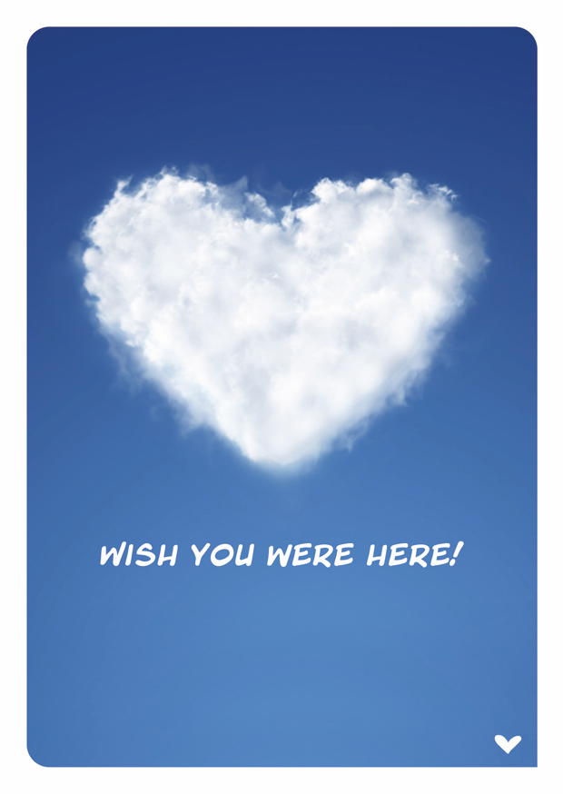 Ein Herz aus Wolken bildet sich vor einem klaren blauen Himmel. Die Botschaft „Wish you were here“ steht darunter und vermittelt Sehnsucht und Liebe in dieser schönen Kulisse.