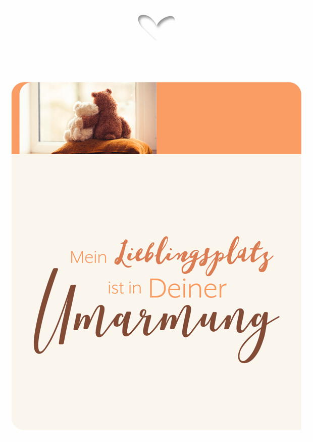 In einem gemütlichen Raum sitzen zwei Teddybären mit Blick auf das Fenster. Der Text beschreibt einen Lieblingsplatz in der Umarmung einer geliebten Person, ideal für Zuneigung und Geborgenheit.