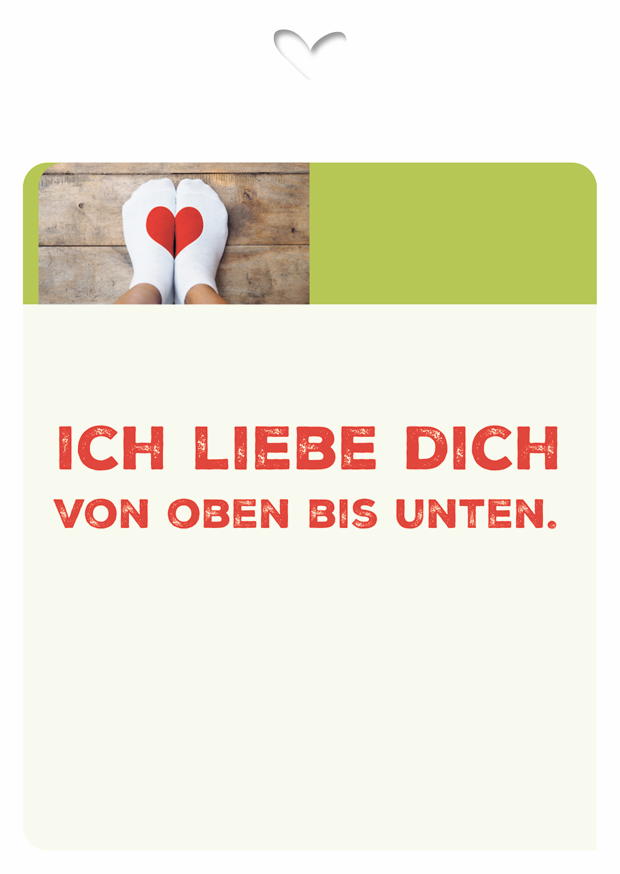 Auf einem Holzfußboden liegen Socken mit einem roten Herzmotiv. Die Botschaft auf den Socken drückt Liebe und Zuneigung aus und ist besonders passend für romantische Anlässe.