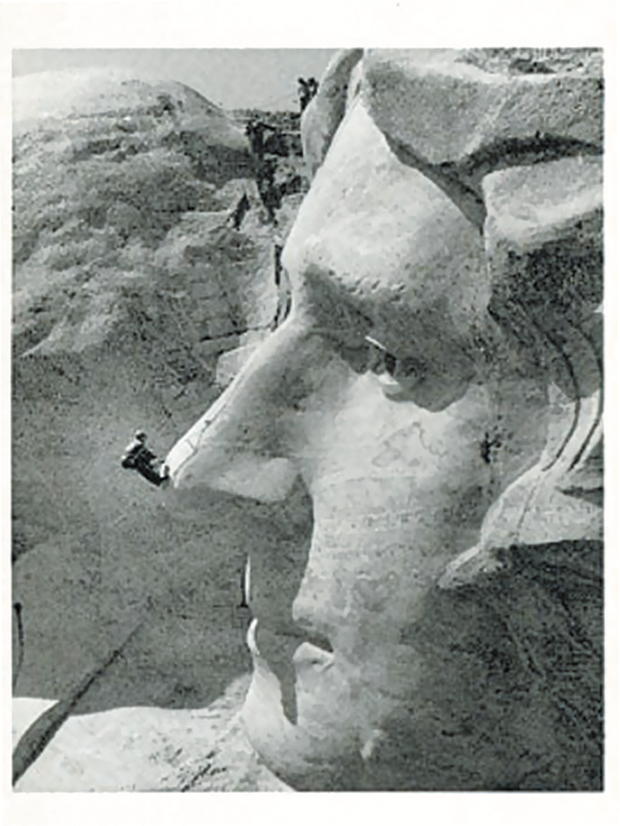 Die Skulptur zeigt ein eindrucksvolles Gesicht mit Handwerkern, die an der Arbeit sind. Der steinige Untergrund ist zu sehen, und es scheint sonnig zu sein.