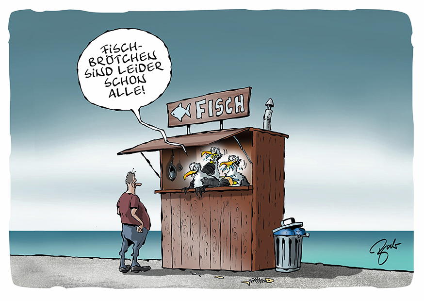 Am Strand steht ein Mann vor einem Fischstand, wo die Verkäufer ihm mitteilen, dass die beliebten Fischbrötchen bereits ausverkauft sind und er enttäuscht wirkt.