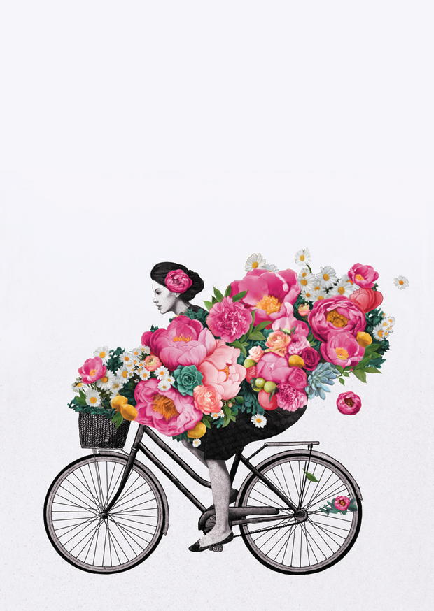 Eine stilisierte Darstellung zeigt eine Frau auf einem Fahrrad, das mit einer Vielzahl bunter Blumen und Blüten gefüllt ist. Diese Szene vermittelt eine fröhliche Frühlingsstimmung.