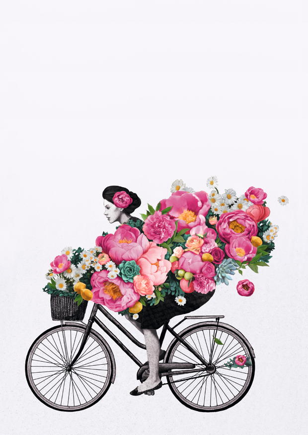 Eine stilisierte Darstellung zeigt eine Frau auf einem Fahrrad, voll beladen mit zahlreichen bunten Blumen. Die lebendigen Farben verleihen der Szene Freude und Frische.