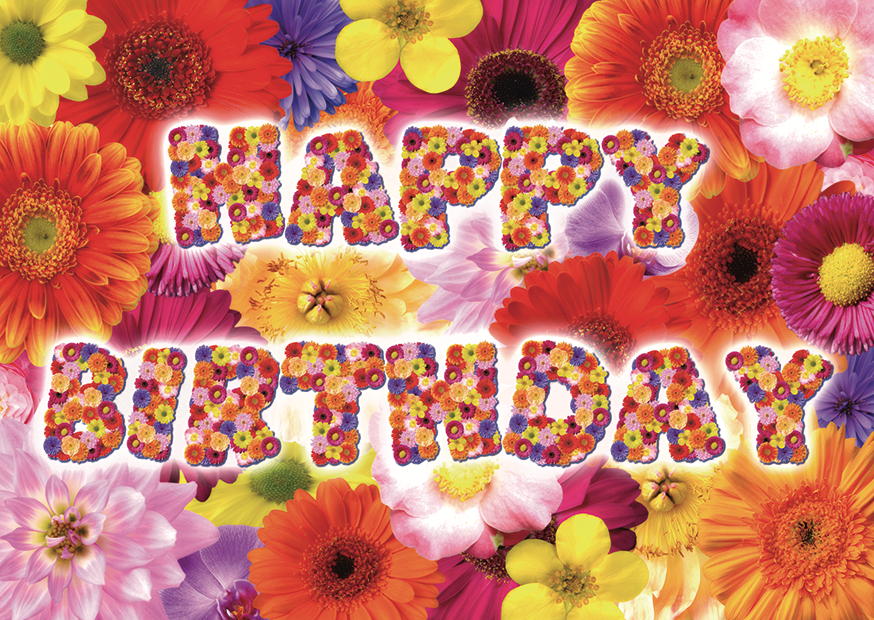 Die kreative Anordnung von Blumen kommt zusammen mit den Worten „Happy Birthday“. Perfekt für Geburtstagsfeiern und als Grußkarte.