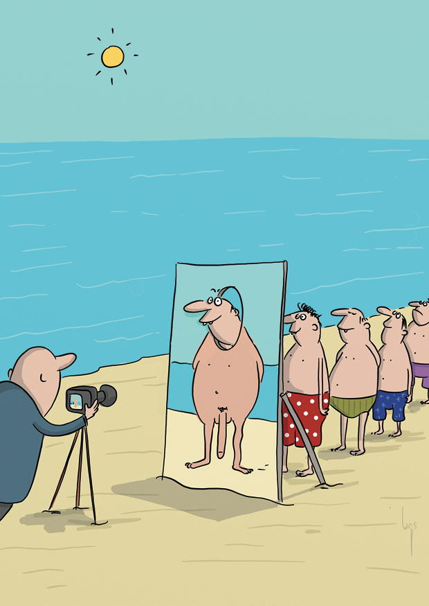 Am Strand posiert ein nackt bekleideter Mann vor einer Kamera, während andere Männer in Badehosen warten, um abgelichtet zu werden.