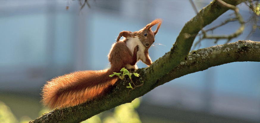 Ein Eichhörnchen sitzt entspannt auf einem Ast und putzt sein Fell im Stadtpark. Der sonnige Tag sorgt für eine angenehme Atmosphäre in der Umgebung.