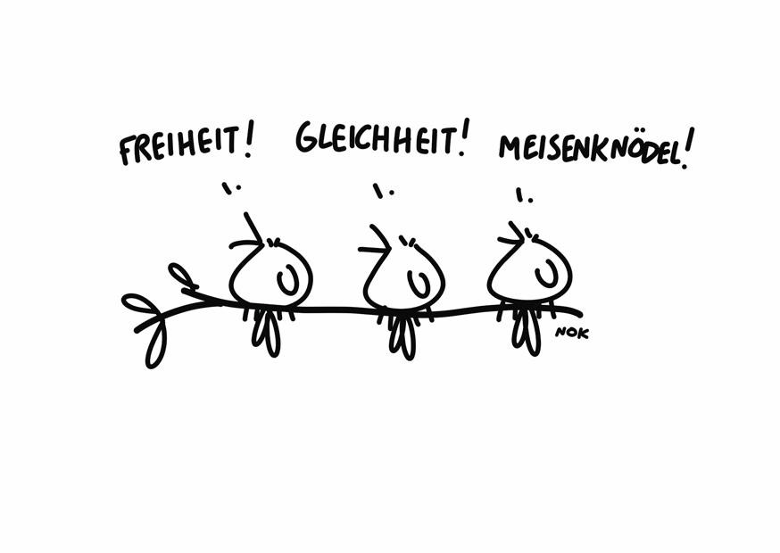 Drei stilisierte Vögel sitzen auf einem Ast und rufen mit Begeisterung nach Freiheit, Gleichheit und Meisenknödel. Der Zeichnungsstil ist einfach und humorvoll gehalten.