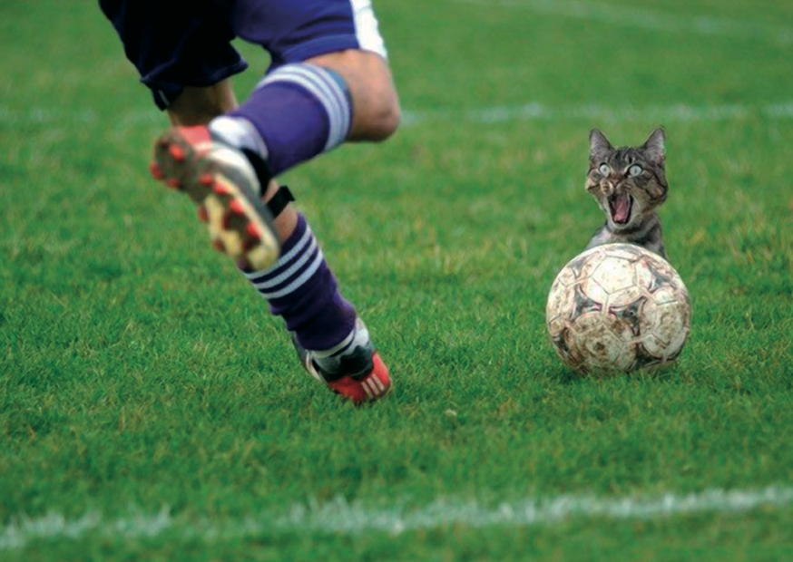 Ein Spieler läuft mit einem Fußball über den Rasen, während eine aufgeregte Katze vor dem Ball sitzt und ihn anstarrt. Die Szene strahlt Freude und Spaß aus.