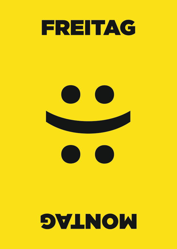 Ein hellgelbes Poster zeigt ein einfaches, stilisiertes lächelndes Gesicht in der Mitte. Darüber steht in Großbuchstaben Freitag, darunter Montag, beide in Schwarz.