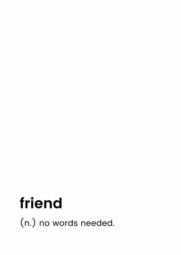 Auf weißem Hintergrund ist das Wort Freund sichtbar, begleitet von der Definition, dass keine Worte benötigt werden, um eine echte Verbindung auszudrücken.