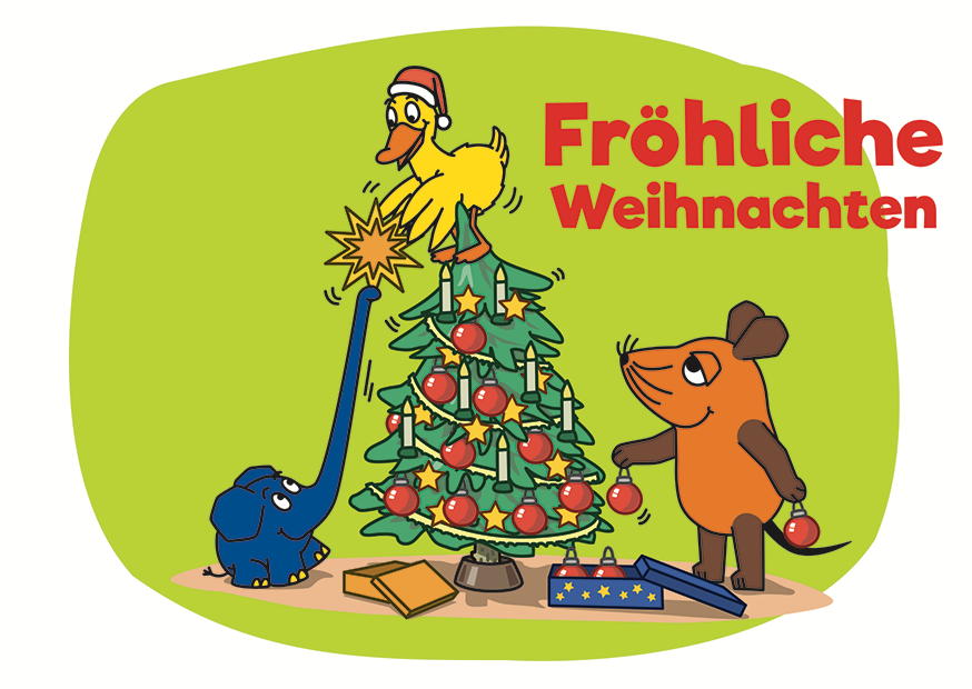 Ein Elefant, eine Maus und eine Ente dekorieren gemeinsam einen Weihnachtsbaum. Die Ente trägt einen Weihnachtsmannhut und hängt einen Stern an die Spitze des Baums.