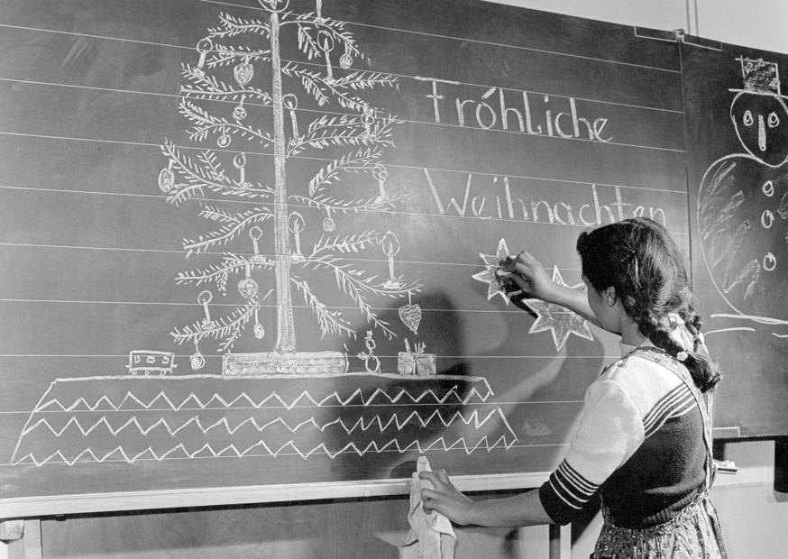Ein Mädchen ist beschäftigt, einen festlichen Weihnachtsbaum an die Tafel zu zeichnen. Um sie herum sieht man verschiedene festliche Elemente. Es ist eine kreative Unterrichtsstunde.