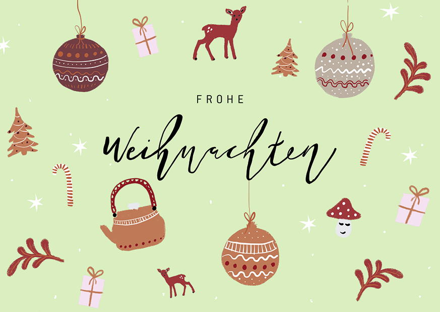 Die Illustration zeigt eine fröhliche Weihnachtsbotschaft mit hübschen Motiven wie Weihnachtsbaumkugeln, Geschenken und einem Reh, alles auf hellgrünem Hintergrund.