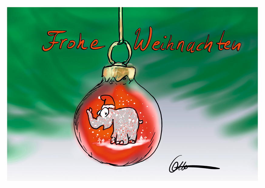 Der Schmuck zeigt einen bunten Weihnachtsbaumanhänger mit einem lächelnden Elefanten in einem Weihnachtsmann-Hut. Perfekt für festliche Dekorationen.