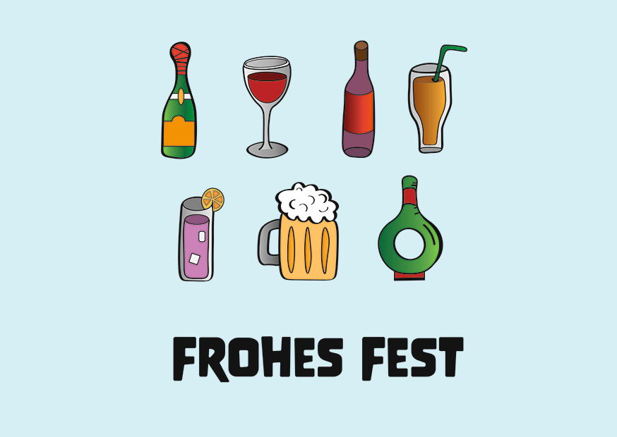 Eine Auswahl von verschiedenen Getränken in einem farbenfrohen Stil, die perfekt für eine fröhliche Feier sind. Von Wein bis Bier ist alles dabei.
