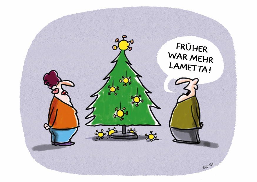 Zwei Männer stehen vor einem schlichten Weihnachtsbaum und reden miteinander. Einer von ihnen äußert, dass früher mehr Lametta vorhanden war, was für Humor sorgt.