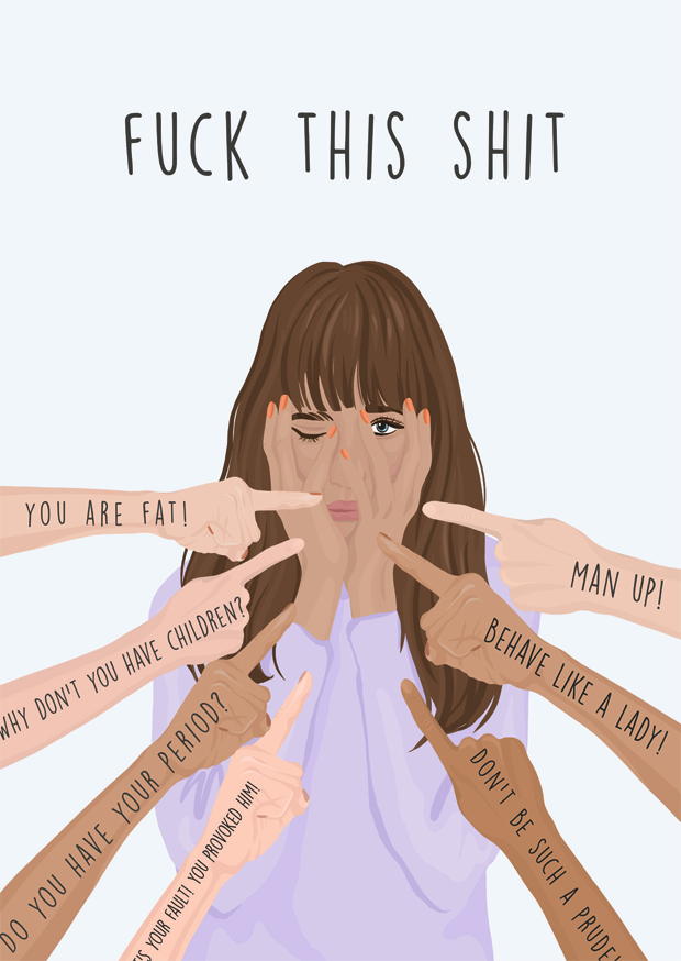 Die Darstellung zeigt eine Frau, die gestresst wirkt, während viele Hände mit Vorurteilen auf sie zeigen. Diese Hände fordern sie auf, sich gesellschaftlich anzupassen.